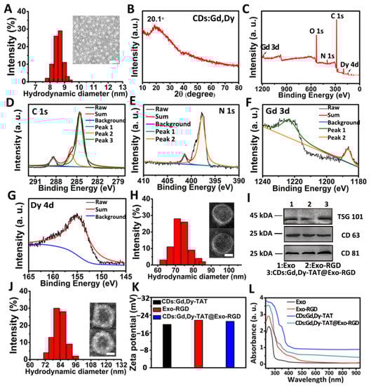 Scheme 1 showed the synthesis method and process of the CDs:Gd,Dy-TAT@Exo-RGD. Gd and Dy-doped CDs (CDs:Gd,Dy) were firstly prepared through the hydrothermal approach choosing dopamine as the carbon source. In TEM images, the CDs:Gd, Dy were homogeneous dots with an average size of 7.9 ± 0.5 nm (Figure 1A). The hydrodynamic diameter obtained from dynamic light scattering (DLS) was measured to be about 8.5 nm. There was a slight difference between the size of TEM and DLS, which was due to the difference in the tested conditions (DLS: aqueous sample, TEM: dry sample). The X-ray diffraction (XRD) spectrum was acquired to identify the crystal nature of CDs:Gd,Dy (Figure 1B). There was a broad diffraction peak at around 20.1° due to the highly disordered carbon atoms, similar to the lattice spacing of graphite. X-ray photoelectron spectroscopy (XPS) analysis was conducted to study the elementary composition and the chemical structure of the CDs:Gd,Dy. As shown in the XPS spectrum of full scan (Figure 1C), there were five dominant peaks assigned to C 1s (285.1 eV), O 1s (532.5 eV), N 1s (398.9 eV), Gd 3d (1187.3 eV) and Dy 4d (156.2 eV). The element valence in CDs:Gd,Dy was then analyzed. The C 1s high-resolution XPS spectrum in Figure 1D showed three peaks at 288.4 eV, 285.7 eV and 284.7 eV, which corresponded to the C=O, C–N/C–O and C=C, respectively. In the N 1s high-resolution spectrum (Figure 1E), there were two peaks assigned at 401.5 eV and 398.2 eV, belonging to the N–H and N–C [35]. These facts demonstrated that the obtained CDs:Gd,Dy were functionalized with hydroxyl, carboxylic acid and amino groups, resulting in remarkable solubility in water. Figure 1F showed two characteristic peaks attributed to Gd 3d3/2 (1224.5 eV) and Gd 3d5/2 (1186.2 eV). The high-resolution spectrum in Figure 1G showed the existence of a peak at 156.1 eV assigned to Dy 4d. Therefore, we concluded that Gd and Dy were successfully incorporated into the CDs.