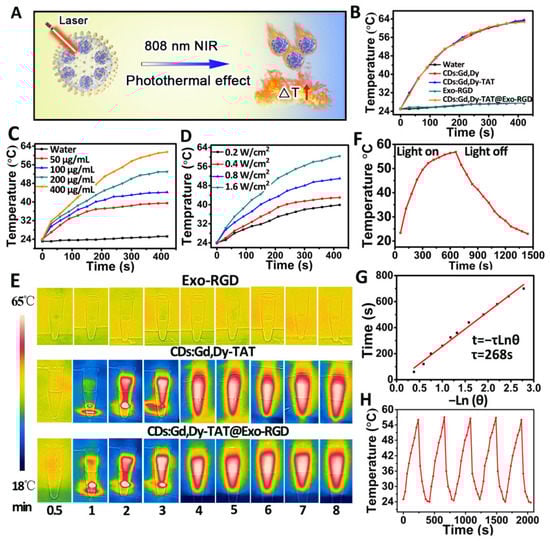 Photothermal conversion performance of CDs:Gd,Dy-TAT@Exo-RGD. (A) The schematic illustration of the photothermal effect triggered by NIR laser. (B) Temperature change curves of water, CDs:Gd,Dy, CDs:Gd,Dy-TAT, Exo-RGD and CDs:Gd,Dy-TAT@Exo-RGD under NIR laser irradiation (808 nm, 1.6 W·cm−2). (C) Temperature change curves of CDs:Gd,Dy-TAT@Exo-RGD (50 μg·mL−1, 100 μg·mL−1, 200 μg·mL−1, 400 μg·mL−1) under NIR laser irradiation (808 nm, 1.6 W·cm−2). (D) Temperature change curves of CDs:Gd,Dy-TAT@Exo-RGD at different laser power densities (0.2, 0.4, 0.8, and 1.6 W·cm−2). (E) Thermal infrared images of Exo-RGD, CDs:Gd,Dy-TAT and CDs:Gd,Dy-TAT@Exo-RGD aqueous solutions under NIR laser irradiation (808 nm, 1.6 W·cm−2) at different time points. (F) Temperature change curve of CDs:Gd,Dy-TAT@Exo-RGD aqueous solution under NIR laser irradiation (808 nm, 1.6 W·cm−2) with laser on and then off after 10 min. (G) Time constant of heat transferring measured by the time versus the negative natural logarithm of the temperature. (H) Temperature change curves of CDs:Gd,Dy-TAT@Exo-RGD solution under repeated (five times) on and off laser irradiation cycling.