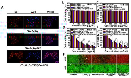 The TAT peptide was beneficial to cell nucleus targeting, and the RGD peptide modification made it efficient for tumor cell targeting. Therefore, it was believed that the CDs:Gd,Dy-TAT@Exo-RGD could act as a dual-ligand targeting drug delivery nanoplatform towards tumors; the targeting was tested through intracellular uptake experiments with recipient cells. The DiI (a red fluorescence dye) labeled CDs:Gd,Dy, CDs:Gd,Dy-TAT and CDs:Gd,Dy-TAT@Exo-RGD were incubated with HeLa cells for 24 h. The uptake of these NPs was detected by fluorescence microscope (Figure 3A). For HeLa cells co-incubated with CDs:Gd,Dy, no evident red fluorescence was observed, demonstrating that few CDs:Gd,Dy were taken up by the cells. For the cells treated with CDs:Gd,Dy-TAT, the fluorescence intensity was dramatically increased compared to CDs:Gd,Dy. Stronger and brighter red fluorescence was found from the cells incubated with CDs:Gd,Dy-TAT@Exo-RGD, and most of the red fluorescence was located in the nucleus region, which indicated that the CDs:Gd,Dy-TAT@Exo-RGD could efficiently accumulate at cell nuclei. CDs:Gd,Dy@Exo-RGD without TAT peptide was mainly located in the cytoplasm, demonstrating the nuclei targeting action of the TAT peptide (Figure S10). These results displayed that the CDs:Gd,Dy-TAT@Exo-RGD could selectively accumulate in tumor cells with deep nuclear-permeating performance. The in vitro cytotoxicity of CDs:Gd,Dy-TAT@Exo-RGD was tested by the MTT method on HeLa cells and 4T1 cells. After 24 h co-incubation with CDs:Gd,Dy, CDs:Gd,Dy-TAT, CDs:Gd,Dy@Exo-RGD or CDs:Gd,Dy-TAT@Exo-RGD, the HeLa and 4T1 cells viabilities were all greater than 90% when the concentrations were 800 μg·mL−1 (Figure 3B,C), showing that the NPs presented superior biocompatibility without laser irradiation. The photothermally induced cell death under NIR laser irradiation of CDs:Gd,Dy-TAT@Exo-RGD on HeLa and 4T1 cells were also measured via the MTT method. As depicted in Figure 3D,E, the cell viabilities significantly decreased with concentration increase when exposed to NIR laser. It should be noted that the cell viabilities of the CDs:Gd,Dy-TAT@Exo-RGD (800 μg·mL−1) treated cells were less than 10% for both HeLa cells and 4T1 cells, which were lower than that of CDs:Gd,Dy (~24%), CDs:Gd,Dy-TAT (~18%) and CDs:Gd,Dy@Exo-RGD (~ 13%).