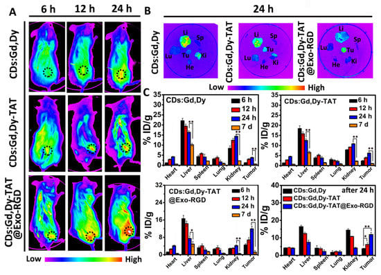 Biodistribution was also assessed by measuring the Gd concentration in the organs of tumor-bearing mice. The mice were administrated with CDs:Gd,Dy, CDs:Gd,Dy-TAT or CDs:Gd,Dy-TAT@Exo-RGD solution through the tail vein (equivalent CDs:Gd,Dy: 15 mg·Gd·kg−1·wt, 100 μL). The mice were then executed after different times (6 h, 12 h, 24 h and 7 day) and the major organs, including heart, liver, spleen, lung and kidney as well as the tumors were collected. The samples were added to concentrated nitric acid and dissolved at 200 °C using a digestion instrument. The amount of Gd was measured using ICP-710ES. The biodistribution was assessed by comparing the Gd content per gram of different samples.