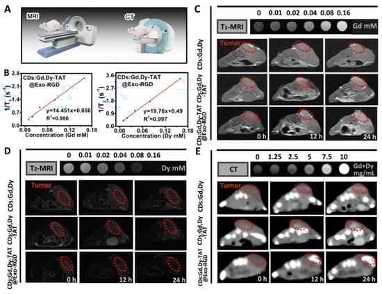 T1-MRI, T2-MRI and CT imaging performance of CDs:Gd,Dy-TAT@Exo-RGD. (A) The schematic illustration of MRI and CT imaging. (B) r1/r2 relaxivity values of CDs:Gd,Dy-TAT@Exo-RGD. In vivo T1-MRI (C), T2-MRI (D) and CT imaging (E) of tumor-bearing mice before and after intravenous injection of CDs:Gd,Dy, CDs:Gd,Dy-TAT or CDs:Gd,Dy-TAT@Exo-RGD for 12 h and 24 h; the red dots circle the tumor site and the images at the top are the corresponding phantom images.