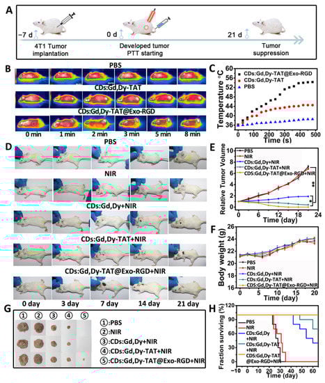 Encouraged by the in vitro photothermal efficacy and in vivo multimodal imaging results, we evaluated the photothermal therapy effect of CDs:Gd,Dy-TAT@Exo-RGD on mice (Figure 6A). The biodistribution analysis identified enhanced accumulation of CDs:Gd,Dy-TAT@Exo-RGD into tumors. therefore, we firstly conducted photothermal imaging through a thermal infrared camera in order to visualize the temperature variation of the tumors in real-time. The tumor-bearing mice were injected with PBS, CDs:Gd,Dy-TAT or CDs:Gd,Dy-TAT@Exo-RGD, followed by NIR laser irradiation after 24 h (Figure 6B,C). The temperature at the tumor site rose only ~2 °C after 8 min irradiation in the PBS only group, indicating that the NIR light was safe for normal organs and skin. The tumor temperature rose to 44 °C for the mice treated with CDs:Gd,Dy-TAT. Predictably, there was a rapid temperature increase in the tumors in the mice treated with CDs:Gd,Dy-TAT@Exo-RGD; the temperature kept constant at about 56 °C, which was sufficient to induce irreversible damage to tumor cells [41]. This temperature increase thus further confirmed the superior photothermal conversion performance of CDs:Gd,Dy-TAT@Exo-RGD.