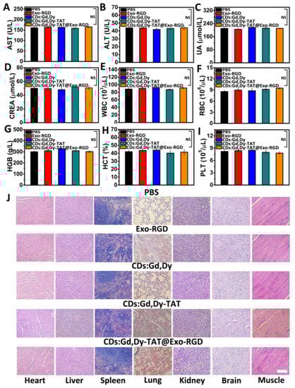 In vivo biocompatibility assessment. (A–D) Serum biochemical markers of ALT, AST, UA, and CREA and (E–I) whole blood cell analysis of the mice treated with PBS, Exo-RGD, CDs:Gd,Dy, CDs:Gd,Dy-TAT or CDs:Gd,Dy-TAT@Exo-RGD two weeks following administration, NS, p > 0.05. (J) H&E images of major organs (heart, liver, spleen, lung, and kidney), brain and muscle from different treatment mice, scale bar: 100 µm.