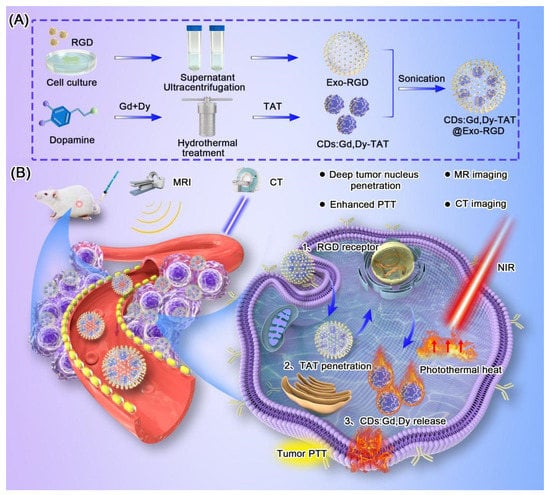 (A) Synthesis schematic illustration of CDs:Gd,Dy-TAT@Exo-RGD. (B) Schematic illustration of CDs:Gd,Dy-TAT@Exo-RGD as a multiple targeted delivery nanoplatform to enhance tumor photothermal therapy and MR/CT imaging.