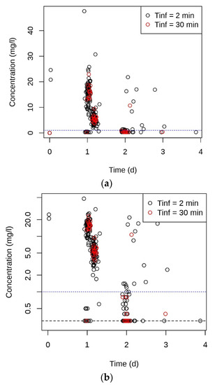 All measured gentamicin plasma concentrations of the 109 patients plotted against time after the start of the first of 2 or 3 infusions. (a) Linear, (b) logarithmic concentration scale. Most concentrations were determined during the 2nd dosing interval. Black and red symbols, concentrations after 2 and 30 min infusion, respectively. Blue dotted lines, recommended maximal trough concentration (1 mg/L). Horizontal broken black line in (b), LOQ (0.3 mg/L). All data were included for the modeling (up to 3 infusions). Concentrations < LOQ are indicated at LOQ in the Figure.