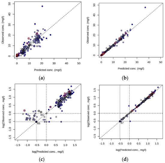 Comparison between measured (observed) and simulated (predicted) gentamicin plasma concentrations on the population (a,c) and individual (b,d) levels, in linear (a,b) and logarithmic (c,d) scales. Blue, light to dark indicates lowest to highest age. Black circle around symbol, gestational age at birth < 37 weeks. Red circle around symbol, serum creatinine > 50 µM. Diagonal line, line of unity. (c,d) Dot within a symbol, male; dotted lines, LOQ (0.3 mg/mL); broken lines, recommended maximal trough level (1 mg/L); number at LOQ intercept, number of data points at LOQ intercept (number of C(t) with measured and simulated value ≤ LOQ).