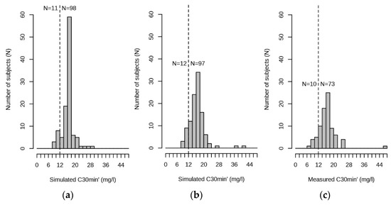 Distribution of the simulated and measured C(30 min’) values. (a) Simulated at population level; (b) simulated at individual level. (c) Measured concentrations within 1 h after infusion stops (available from 83 patients). Vertical broken line shows the recommended maximal C(30 min’) for long-duration treatment (12 mg/L). N, numbers of patients with C(30 min’) below 12 mg/L (left to the broken line), and above 12 mg/L (right to the broken line).