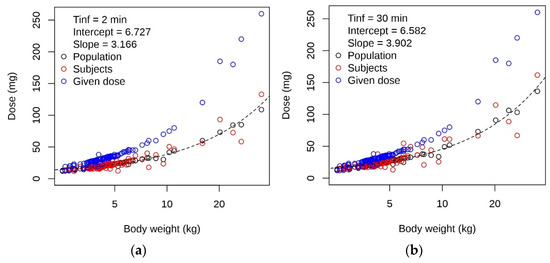 Predicted doses to reach C(30 min’) between 10 and 12 mg/L, calculated with the final model and compared to the given doses. (a) For 2 min and (b) for 30 min infusion duration. Predictions were made on the population (black symbols) and individual (red symbols) level. Blue symbols, given dose. Broken line, line with intercept (in mg) and slope (in mg/kg) from the linear regression analysis (predicted dose on individual level vs. body weight, parameters as indicated in the plots; note that bodyweight is in logarithmic scale).