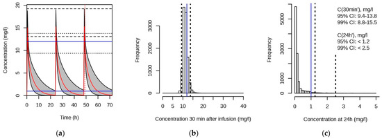 Plasma concentrations simulated with the final model to reach C(30 min’) between 10 and 12 mg/L. Simulations for 30 min infusion time. (a) Plasma-concentration time curves. Grey, 95% CI of the simulated concentrations (from 100 simulations per subject, i.e., 10,900 simulations in total). Red, median C(t) at each time point. Blue horizontal lines show recommended maximal trough (1 mg/L), and maximal C(30 min’) level for long-duration treatment (12 mg/L). Horizontal dotted and broken lines, 95% CI of the simulated C(30 min’) and maximal levels (at infusion stop), respectively. Vertical dotted red line, time point for C(30 min’). (b) Distribution of the simulated C(30 min’). Vertical blue line, 12 mg/L. Vertical black broken lines, 95% CI of the simulated C(30 min’). (c) Distribution of the simulated C(24 h’). Vertical blue line, 1 mg/L. Vertical black broken lines, 95% and 99% upper CI of the simulated C(24 h’). The 95% and 99% CI values for the simulated C(30 min’) and C(24 h’) are provided in panel (c).