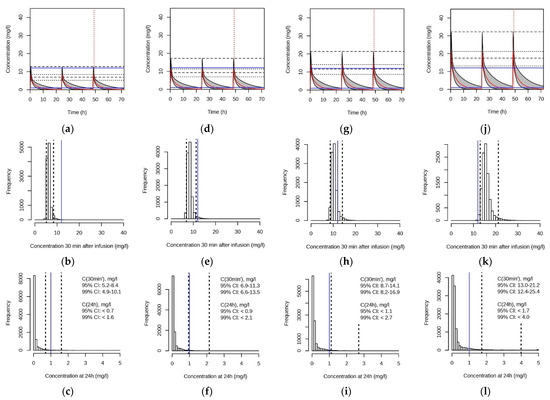 Simulations with the final model over 3 dosing intervals of 24 h each with 30 min infusion time. Once daily dose was (a–c) 3 mg/kg; (d–f) 4 mg/kg; (g–i) 5 mg/kg; (j–l) 7.5 mg/kg. (a,d,g,j) Simulated plasma-concentration time curves. (b,e,h,k) Respective distributions of simulated C(30 min’) of the third infusion. (c,f,i,l) Distributions of the simulated C(24 h’) of the third infusion. For further details, see Figure 6.