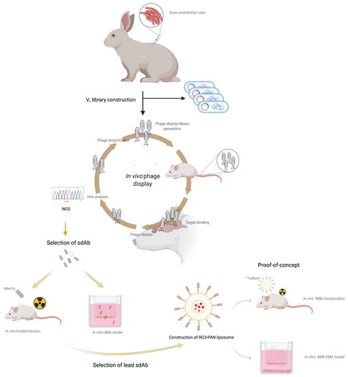 In the quest to develop BBB specific antibodies, Muruganandam and collaborators [] have proposed two promising brain-targeting sdAbs, FC5 and FC44, that were selected by phage display from a camelid VHH library. These two VHHs displayed significant brain accumulation in mice and rapid elimination through kidneys and liver []. FC5 was further demonstrated to engage active RMT through the luminal alpha(2,3)-sialoglycoprotein receptor (TMEM30A) [] and engineered as a FC5-Fc-neuropeptide to validate CNS delivery properties [,]. More recently, in a very elegant study, Zuchero et al. performed a detailed transcriptomic and proteomic analysis of mouse brain endothelial cells that allowed the identification of three robust BBB receptors for drug delivery, with translation into the human setting, namely, basigin, glutamate receptor 1 and CD98 heavy chain (CD98hc) []. Antibodies developed towards CD98hc presented improved brain targeting and drug delivery properties when compared with the IR and TfR []. These studies paved the way to the identification of novel and more promising BBB receptors for biotherapeutic drug delivery into the brain. Nevertheless, these BBB-targets were identified by in vitro selection studies that do not fully mimic the in vivo environment of the BBB and possibly compromise the expression levels and conformation of its native receptors. Indeed, if we look into the in vivo BBB characteristics, it is known that BBB endothelial cells get stimulated by their surrounding cells and intraluminal blood flow [,]. This regulates the expression of specific receptors at the cell surface in a polarized fashion contributing to the complexity of the BBB. For these reasons, screening for highly selective BBB transmigrating antibodies should preferably be performed in vivo. As such, in the present study we explored the potential of a whole cell in vivo immunization approach in rabbits followed by an in vivo phage display selection in a murine model aiming to develop potent BBB transmigrating nano-antibody scaffolds, as illustrated in Figure 1. To achieve this, a rabbit derived immunized sdAb library towards brain endothelial cells receptors was constructed and brain specific nano-antibodies were recovered in an in vivo phage display assay. With this combinatorial approach we successfully identified a panel of novel BBB crossing sdAbs that can specifically target and reach the brain. In order to evaluate the potential of our selected sdAbs for CNS drug delivery, the most promising lead antibody was engineered at liposomes surface encapsulating a model drug that has been demonstrated not to cross the BBB, the pan-histone deacetylase inhibitor (HDACi) panobinostat (PAN) [], and its BEB transmigrating properties and anti-tumor activity were evaluated in a dual functional in vitro BEB-glioblastoma model.