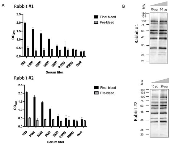 Analysis of rabbit immunological response: (A) ELISA serum titration of Rabbit #1 and Rabbit #2 total serum against bEnd.3 endothelial cells. Total rabbit serum was diluted by serial dilution (from 500 to 32,000-fold) and tested in 2 × 104 cells/well. Results showed a selective and specific immune response against bEnd.3 cells. (B) Target validation and assessment of potential bEnd.3 receptors recognized by each rabbit serum following immunological boost by WB. Total protein extract was obtained with RIPA buffer from bEnd.3 and 10 μg and 20 μg was loaded in a 11% SDS page acrylamide gel. Following gel transfer and membrane blockage, total rabbit serum 500-fold diluted was added to determine the specificity of the antibodies produced by the rabbit immunization process towards bEnd.3 total protein extract. Results demonstrated that antibodies towards several receptors were developed in both immunized rabbits validating our immunization approach.