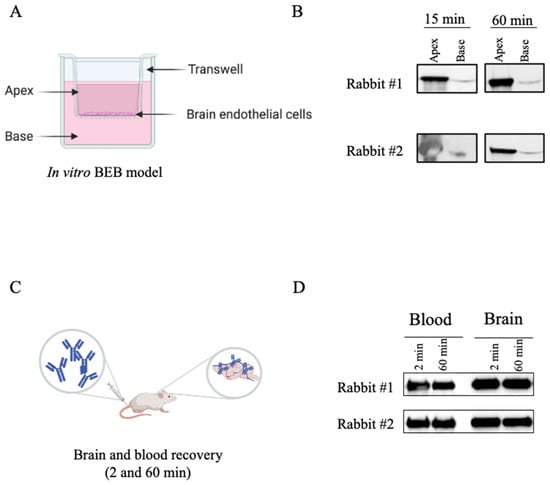 Validation of the rabbit serum BBB crossing features. To confirm that the antibodies obtained from the rabbit immunization process retained the ability to cross the BBB, purified serum from both rabbits were tested in both in vitro and in vivo models. (A) For the in vitro BEB model 4 × 103 bEnd.3 cells were seeded in 24-well plates tissue culture inserts and incubated for 11–14 days in a humidified chamber at 37 °C, supplemented with 5% CO2. (B) To determine the rabbit serum translocation efficiency, 10 µg of purified serum was added to the apex, incubated for 15 and 60 min, recovered from both the apex and the base, and analysed by WB. Rabbit serum was detected at the base of the monocellular model in both time points validating the translocation ability of the rabbit IgGs. (C) To confirm the ability to reach the brain in an in vivo model, purified serums (250 µg) were intravenously injected into the tail vein and after 2 and 60 min the mice were sacrificed, and the brain extracted. (D) Rabbit immunoglobulins were recovered from the mice blood and homogenized brains by IP with protein A beads and analysed by WB with goat anti-rabbit-HRP IgG at 1:1000. The detection of the rabbit serum in the brain extract validated the ability of rabbit derived antibodies to reach the mice brains and further confirmed the anticipated species cross-reaction.