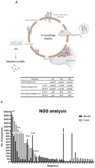 To analyse the enrichment and profile obtained after each round of in vivo phage display selection, individual clones from the initial VL sdAb library, second and third selection rounds were randomly chosen and sequenced at Eurofins company. Sequence analysis was performed using the Vector NTI software (Invitrogen) and antibody frameworks, CDRs and the amino acid numbering and sequences alignment were performed as defined by Kabat et al. []. Furthermore, to analyse the overall diversity and enrichment obtained, we performed NGS. For that, we used the 250-paired ended module of the MiSeq (Illumina, San Diego, CA, USA) sequencing platform to obtain the whole sequence of the VL sdAb regions selected in the third biopanning for both time points (2 min and 60 min). The Miseq library for DNA sequencing was prepared by amplifying the VL sdAb regions and 2 µg of the purified amplicons were sent to the STABVIDA company for sequencing. The NGS sequence data was analyzed using the Geneious software (Biomatters Ltd., Auckland, New Zealand). Sequence data was processed by merging the paired-ended sequence reads, translating the sequence into protein and discarding all sequences with less than 100 amino acids and no SfiI cut site and histidine tail sections. Subsequently, an in-house custom python script was developed to summarize and count the sequence reads. Bar charts representing the pattern of sequence reads were generated.