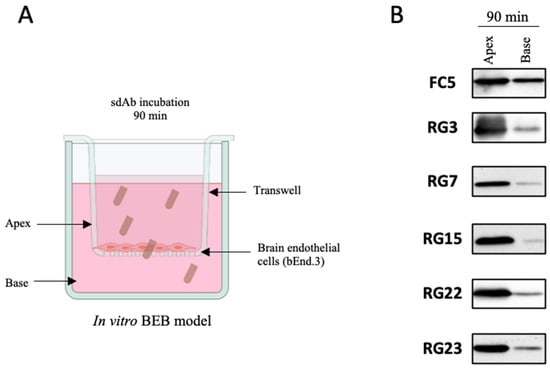 In vitro selection of the dominant sdAbs clones. With the aim of selecting the most competent clones in transposing the BBB, the clones with higher frequency in NGS analysis and proficient in terms of expression and solubility properties (data not shown) were selected for further characterization in terms of in vitro BEB model translocation efficacy. (A) 15 μg of each purified sdAb was added to the apex of the transwell and incubated for 90 min. (B) Following incubation period, all volumes were collected from the apex and the base and analysed by WB with anti-HA antibody.