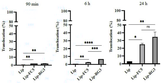 Translocation of RG3 and FC5 functionalized liposomes in the in vitro BEB model (Lip-RG3 and Lip-FC5). To determine the effect of RG3 functionalization in liposome in vitro BEB translocation, rhodamine loaded, biotinylated liposomes were surface modified with RG3 and added to the apex of the transwell, as described previously, and incubated for 90 min, 6 h and 24 h. The translocation percentage was determined by measuring the rhodamine fluorescence intensity at the base. Non functionalized liposomes (Lip) and FC5 functionalized liposomes (Lip-FC5) were used as controls. A one-way ANOVA statistical test followed by a Turkey’s test was used to compare each liposomal formulations (**** p < 0.0001; *** p < 0.001; ** p < 0.01; * p < 0.05; ns, not statistically significant).