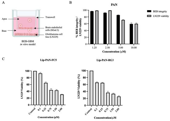 Finally, the antiproliferative activity of the PAN loaded in RG3 and FC5 conjugated liposomes following BBB translocation was determined in a dual functional in vitro BEB-glioblastoma model (BEB-GBM) (Figure 7). To develop the BEB-GBM model, a non-contact co-culture system composed of bEnd.3 as the BBB barrier and the LN229 cell line at the base as the GBM cell line was implemented (Figure 7A). To evaluate the cytotoxicity on bEnd.3 cells and determine the most appropriate PAN concentration to be tested in the BEB-GBM model, increasing concentrations of free PAN were added to the apex of the BEB-GBM model and its effect in the BEB integrity and LN229 cytotoxicity was determined. As shown in Figure 7B, no significant effect in the BEB integrity and LN229 viability was observed when PAN free was added below 2.5 µM. Thus, the BEB translocation efficiency and drug delivery of the PAN encapsulated in RG3 and FC5 functionalized liposomes was assessed by adding liposomes to the BEB-GBM model apex following 24 h incubation at different concentrations (0.1–2.0 µM). As shown in Figure 7C, both RG3 and FC5 functionalized PAN liposomes were able to translocate the in vitro BEB-GBM model and exhibited a dose-dependent inhibitory effect in the LN229 cell line without influencing the overall barrier integrity of the monocellular model (Supplementary Material Table S1). A similar study was performed by Mu and collaborators. The authors developed vinblastine liposomes functionalized with a transferrin targeting molecule, the TfR-T12, to potentiate the translocation of vinblastine across the BBB and eliminate brain glioma []. As in the present study, the authors validated the BBB targeted lipid base nanoparticle in an in vitro model and observed a significant killing effect against the glioma cell line, further supporting the drug delivery strategy.