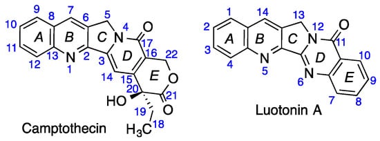 - Kacprzak, K.M. Chemistry and biology of camptothecin and its derivatives. In Natural Products; Ramawat, K., Mérillon, J.M., Eds.; Springer: Berlin, Germany, 2013. [Google Scholar]