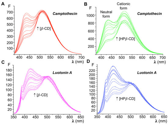 We started our work by examining the changes in the fluorescence spectra of the alkaloids in the presence of increasing amounts of both cyclodextrins under study, as a proof of their inclusion. Both alkaloids have at least one basic nitrogen that can be protonated under strongly acidic conditions, and it can be reasonably assumed that the more lipophilic neutral form is the one that is primarily included in the cyclodextrin cavity. In the case of camptothecin, the fluorescence emission of the cationic form has a maximum at 510 nm, while the corresponding neutral form emits at 428 nm [42,44]. The corresponding values for luotonin A are λem (cationic form) = 502 nm and λem (neutral form) = 426 nm [43].