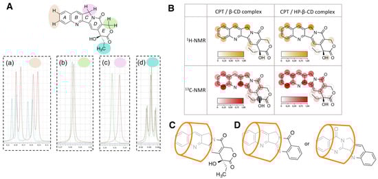 (A) Changes observed in selected signals of the camptothecin 1H-NMR spectrum upon complexation with β-cyclodextrin, showing significant changes in the position of the signals in (a) and (c) and only slight changes in (b) and (d). (B) Normalized (0–1) chemical shift changes in the 1H-NMR and 13C-NMR spectra of camptothecin following complexation with β-cyclodextrin and hydroxypropyl-β-cyclodextrin. (C) Model of inclusion of camptothecin inside the β-CD cavity according to NMR data. (D) Two alternative models of inclusion of luotonin A inside the β-CD cavity according to NMR data.