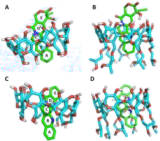 Docking studies showed that camptothecin forms complexes with both CDs having the A and B rings fully inserted in the cavity, the C ring placed in an intermediate state and the rest of the molecule outside. In the case of the luotonin A-CD 1:1 complexes, the D and E rings are completely inside the cavity, C is placed in an intermediate state and B and A are outside (β-CD complex) or resting along the hydroxypropyl chains (HP-β-CD complex) (Figure 4). An alternative pose with the A and B rings inside the cavity and the D and E rings outside showed an almost identical calculated stability, suggesting that both poses are viable and in agreement with the NMR data summarized above.