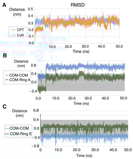 Molecular dynamics studies: (A) RMSD for the camptothecin-β-CD and luotonin A-β-CD complexes; (B) evolution of the distance between the center of mass (COM) of β-CD and the center of mass of camptothecin, and similar study of the center of ring A; (C) evolution of the distance between the center of mass of β-CD and the center of mass of luotonin A, and similar study of the center of ring E.
