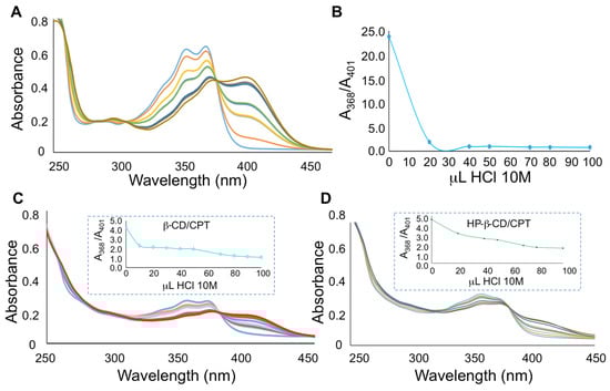 Solutions of native camptothecin as well as its inclusion complexes were prepared with the amount of alkaloid suitable to achieve a 1.0 × 10−5 M concentration in the aqueous solution. Aqueous HCl standardized solutions with 0.1 M, 1.0 M and 10.0 M concentrations were initially assayed as titrating agents; however, we found that the lower-concentration solutions required high volumes to observe the spectral changes due to the protonation of camptothecin, and for this reason 10.0 M HCl was chosen for subsequent work. Figure 6A shows the protonation of camptothecin, revealed by the appearance of a band at 410 nm with an intensity proportional to the acid concentration and a concomitant decrease in the absorbance values at the wavelengths characteristic of the neutral form (350 and 368 nm). On the other hand, in the case of the HP-β-CD and β-CD complexes the same HCl concentration causes a weak shoulder in the 400–430 nm region and a very slight decrease in absorbance maxima corresponding to the neutral camptothecin. Therefore, the protonation of free camptothecin is easier in comparison to the CD complexes, as the accessibility of CPT/CD complexes to protons is hampered. The ratiometric titration plots (Aneutral/Acation vs. volume of the titration agent) (Figure 6B and insets in Figure 6C,D) show that the protonation of free camptothecin is complete after addition of 30 μL of HCl. In the case of CPT/CDs complexes, the addition of the same volume of acid produces absorbance ratios around 2 to 3, depending on the CD involved, showing protection towards protonation of camptothecin in the presence of cyclodextrins.