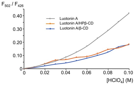 The fluorescence emission intensities of luotonin A and its complexes with β-CD and HPβ-CD were processed in the course of their titration with perchloric acid. Solutions of native luotonin A as well as the inclusion complexes were prepared with the amount of alkaloid suitable to achieve a 1.0 × 10−6 M concentration in the aqueous solution. Increasing volumes of 1.0 M perchloric acid caused a decrease in the fluorescence emission of the neutral form (λex = 342 nm, λem = 426 nm) accompanied by an increase of the emission intensity for the cationic form (λex = 392 nm, λem = 502 nm). Because the absolute values of the fluorescence intensity for neutral and cationic forms are quantitatively different as a consequence of their different fluorescence quantum yields [49], we performed a ratiometric titration of the alkaloid and its complexes. As can be observed in Figure 7, protonation of luotonin A is notably easier for the free alkaloid than for the corresponding inclusion complexes. A final 0.1 M concentration of perchloric acid causes the protonation of luotonin A and a fluorescence intensity ratio cationic/neutral of 0.45 is reached. In the case of luotonin A-CD inclusion complexes, the cationic/neutral fluorescence intensity ratio was only 0.15. This result clearly shows that the protonation is hampered in the case of the CD complexes.