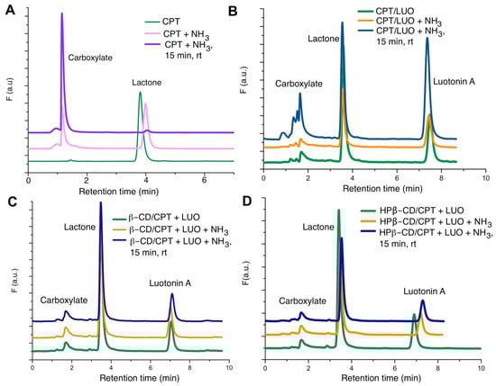 Chromatograms showing that CD complexation protects camptothecin from hydrolysis. (A) Hydrolysis of the camptothecin lactone E ring in the presence of aqueous ammonia. (B) The same reaction followed by separation in the presence of luotonin A as an internal standard. (C) Campothecin hydrolysis in the presence of β-cyclodextrin. (D) Campothecin hydrolysis in the presence of HP-β-CD.