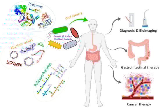 Bacteria play extensively, yet important, roles in our lives both directly and indirectly []. With the development of interdisciplinary research on bacteria and their applications, numerous bacteria have been widely administrated as oral probiotics or bacterial therapeutics for treating various diseases including cancers, diabetes, inflammatory bowel diseases (IBDs), and pathogenic infections [,,,,,,]. Due to their unique characteristics, such as genetic manipulation, rapid proliferation, and targeting specificity to disease sites, bacteria have successfully expressed different kinds of biologics through biological technologies and exhibited extremely promising potential to be utilized in bioimaging, diagnosis, and therapy [,,]. Currently, the reported therapeutic biomacromolecules that are delivered by bacteria mainly include proteins, glycans, and nucleic acids. In this section, we focus on the introduction of the types and biomedical functions of these biomacromolecular drugs.