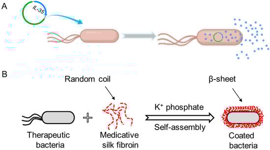 Engineered bacteria for the oral delivery of therapeutic proteins. (A) Oral delivery of heterogeneous interleukin (IL)-35 expressed by genetically modified bacteria. Adapted from [], published by Springer, 2019. (B) Oral co-delivery of therapeutic silk fibroin and probiotics through self-assembly on the surface of bacteria for synergistically enhanced biotherapy. Adapted with permission from []; published by Wiley-VCH, 2021.
