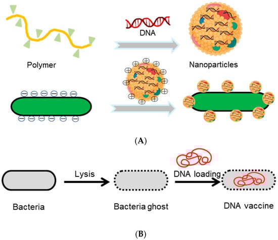 To overcome obstacles encountered in the oral administration of nucleic acids, numerous strategies that can address instability resulted from enzymatic degradation and side effects caused by anionic charges and enhance the oral bioavailability have been developed [,]. It is worth noting that some of them have entered into clinical trials [,]. The main approaches developed for nucleic acid delivery can be categorized into non-virus (such as liposomes, polymer vectors, and plasmid DNA) and virus vectors (such as adenovirus and retrovirus) [,]. As an alternative, bacteria have been extensively engineered to deliver nucleic acids, such as plasmid DNA, aptamers, and DNA vaccines for treating IBDs and colon cancer [,,]. Non-pathogenic bacterial species are considered as a promising approach to drug delivery in both forms of intravenous injection and oral administration. For example, the human Elafin gene, encoding Elafin that is absent in mucosa of IBD patients, has been delivered via a plasmid vector inside oral probiotics for inflammation inhibition and intestinal flora regulation []. Additionally, Lactococcus lactis has been developed as a therapeutic microdevice to deliver IL-10 gene that encodes an immunomodulative protein for IBD treatment []. With the merit of in situ production, IL-10 is able to avoid degradation from intraluminal harsh environments and maintain their native therapeutic activities []. Meanwhile, pathogenic bacteria, such as Clostridium species, Salmonella Typhimurium (S. Typhimurium), and Listeria monocytogenes, have been applied for targeted tumor killing and oral vaccines [,,,]. Since these invasive species can deliver heterologous genes into tumor cells for expressing antitumor drugs, their tumor killing efficacies have been improved significantly [,]. Furthermore, chemically modified bacteria have been investigated for the oral delivery of DNA. For instance, Hu and colleagues have developed an engineered bacterium that is anchored with cationic DNA nanoparticles on the surface (Figure 3A) []. Equipped with protective DNA nanoparticles layers on the surface, bacteria succeed in escaping phagosomes and remain intact and active after exposure to the GI tract. The delivered DNA vaccines are able to encode vascular endothelial growth factor receptor 2 (VEGFR2) and activate T cells, showing significant inhibition against tumor growth []. Additionally, bacterial ghosts, empty bacterial envelopes that lack infectious abilities but display bio-adhesive properties, have been explored as vectors for the delivery of DNA drugs [,]. In order to induce peripheral and mucosal immune responses, Wen et al. have delivered HIV-1 gp-140 DNA vaccine through S. typhimurium-derived bacterial ghosts, which could activate antibody responses via the TLR4 pathway (Figure 3B) [].