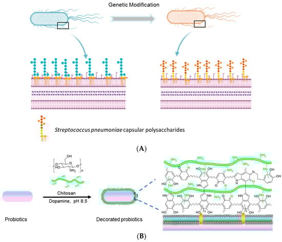 Engineered bacteria for oral delivery of therapeutic polysaccharides. (A) Oral delivery of Streptococcus pneumoniae capsular polysaccharides produced by recombinant attenuated Salmonella. Adapted from [], published by National Academy of Sciences, 2021. (B) Attachment of chitosan on the surface of probiotics for enhanced oral delivery and biotherapy. Adapted with permission from []; published by Wiley-VCH, 2021.