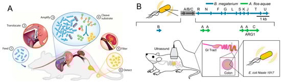 - Naydich, A.D.; Nangle, S.N.; Bues, J.J.; Trivedi, D.; Nissar, N.; Inniss, M.C.; Niederhuber, M.J.; Way, J.C.; Silver, P.A.; Riglar, D.T. Synthetic Gene Circuits Enable Systems-Level Biosensor Trigger Discovery at the Host-Microbe Interface. mSystems 2019, 4, e00125-19. [Google Scholar] [CrossRef] [PubMed]