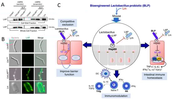 Engineered Lactobacillus for treating Listeria infection. (A) Detection of the expression of LAP from Listeria by western blot, showing LAP presenting in both the cell wall and whole-cell fractions of engineered Lactobacillus strains. (B) Immunofluorescence images of LAP expressed successfully on the surface of engineered Lactobacillus. (C) Schematic illustration of the mechanism for the protection effect of engineered Lactobacillus against listeriosis. Adapted with permission from []; published by Springer Nature, 2020.
