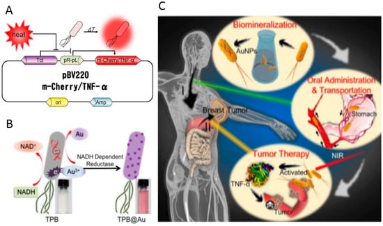 To facilitate oral delivery, antitumor biomacromolecular therapeutics, such as cytotoxic proteins, cancer-specific antigens, and cytokines, have been encoded into bacteria by genetic engineering, which can produce inducibly or constantly [,,,,]. Chung et al. have developed a bacteria-based drug delivery platform for treating colorectal cancer []. A lactic acid bacterium Pediococcus pentosaceus is modified to produce a small protein (P8) against CRC fused with a secretion signal peptide under the control of a strong inducible promoter. After oral administration into the intestine, the engineered anti-CRC therapeutic probiotics demonstrates significant anticancer efficacies in two different tumor-bearing mouse models. Combining expressing therapeutic protein TNF-α driven by a thermal-sensitive promoter and decorating with biomineralized gold nanoparticles (AuNPs) on the bacterial surface, E. coli MG1655 is engineered both genetically and chemically to generate a thermal-sensitive therapeutic platform termed as TPB@Au (Figure 8A,B) []. The engineered bacteria deliver Au nanoparticles to tumor site with the help of bacterial inherent homing capability. Upon near-infrared light irradiation, the Au nanoparticles generate heat and induce the expression of TNF-α, which could kill tumor cells (Figure 8C). In addition, researchers have generated a bacteria-based oral DNA vaccine for cancer therapy. Attenuated Salmonella was decorated with DNA nanoparticles that could encode autologous vascular endothelial growth factor receptor 2 (VEGFR2) on the surface (Figure 3A) []. The results suggested that the acid resistance of this vaccine is improved remarkably, due largely to the protection effects of the nanoparticle layers. With the assistance of bacteria that enhances the accumulation of more DNA inside tumor tissues, significantly improved therapeutic efficacy is observed in tumor-bearing mice.