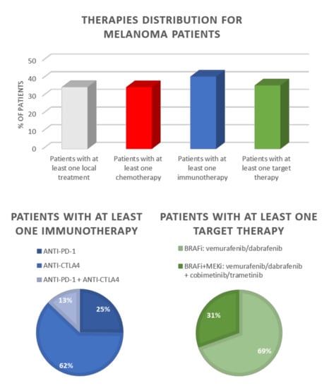 Summary of the most common therapeutic approaches in the Italian clinical landscape for the treatment of advanced metastatic melanoma. Between 30 and 40% of all patients receive at least one immunotherapy or at least one targeted therapy (upper panel). Among the patients treated with immunotherapeutic agents, Anti-CTLA4 (ipilimumab) monotherapy is the most administered (lower panel, left). BRAFi and MEKi combination is the most used targeted therapy (lower panel, right). Data elaborated from [].