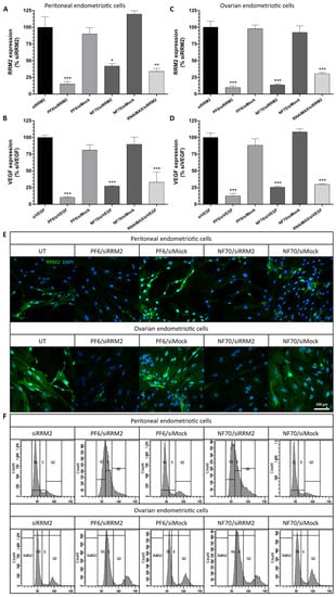 CPP/siRNA NPs induced therapeutic gene knockdown, RRM2 protein decrease, and cell cycle arrest in endometriotic cells. (A,B) RRM2 and (C,D) VEGF gene expression levels measured in (A,C) peritoneal and (B,D) ovarian endometriotic cells using qRT-PCR. Data were analyzed by 2−ΔΔCT method using GAPDH as an internal control and normalized to relevant pure siRNA groups. Error bars represent SEM of n = 7–8 individual samples from independent experiments. * p < 0.05, ** p < 0.01, *** p < 0.001, one-way ANOVA, Tukey post hoc. (E) Representative immunocytochemical staining of RRM2 (green) in endometriotic primary cells counterstained with DAPI (blue); scale bar: 100 µm. (F) Representative flow cytometry graphs of propidium-iodide-stained endometriotic peritoneal and ovarian cells. All of the data (A–F) were collected 48 h after transfection and representative images (E,F) are from 3 independent experiments. UT, untreated.
