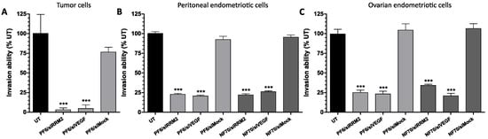 It is well known that invasion plays an important role in the progression of both cancer and endometriosis []. Furthermore, adding another component, an extracellular matrix, into the experiment better mirrors the natural physiological environment of the pathological tissue. Therefore, we proceeded with evaluating the diseased cells’ invasive capability through the Matrigel extracellular matrix after CPP/siRNA treatment and chemoattraction to FBS. The effect of NP transfection to cell phenotype was first investigated in U-87MG tumor cells. As a result, a marked decrease of up to 97% in cell invasiveness was observed after PF6/siRRM2 and PF6/siVEGF treatment (Figure 3A). To continue, in the case of primary peritoneal (Figure 3B) and ovarian (Figure 3C) endometriotic cells, the invasion through the extracellular matrix was also significantly hindered by up to 80%.