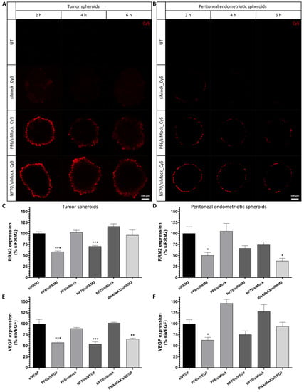 As a first step, tissue penetration of CPP NPs with fluorescently labelled siMock was evaluated in a U-87MG tumor (Figure 4A) and peritoneal endometriotic primary spheroids (Figure 4B). The mid-height z-stack sections of live spheroid confocal imaging are presented. As a result, siRNA accumulation was mainly seen in the cells situated in the outer rim of the spheroids. After confirmation that PF6 and NF70 are capable of transfecting 3D spheroids, we next treated the 3D cultures with therapeutic CPP/siRNA NPs. In case of tumor spheroids, RRM2 (Figure 4C) and VEGF (Figure 4E) were both significantly downregulated by PF6- and NF70-mediated siRNA delivery, whereas lipofection was only significantly effective in knocking down VEGF (Figure 4E). When looking at the gene expression levels of peritoneal endometriotic spheroids, therapeutic CPP/siRNA formulations again exhibited strong tendencies towards downregulating the target genes (Figure 4D,F).