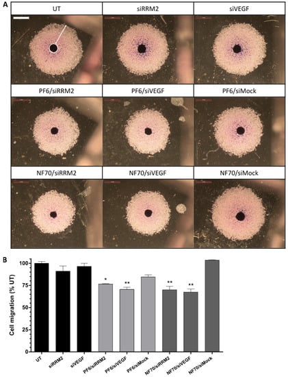 The successful knockdown of therapeutic genes in 3D models using CPP/siRNA NPs encouraged us to further investigate the functional effects using disease-specific approaches. One of the crucial steps in the progression of tumors is cancer cell migration. Therefore, we adopted a spheroid-based functional assay [,] to investigate the effect of downregulation of RRM2 or VEGF on tumor cell migration. Once transfected spheroids were planted on the gelatin-coated surface, tumor cells started disseminating from the spheroid and migrating over the surface. Spheroids can be seen as a dark dot in the middle of the representative microscopic images (Figure 5A) and the migrated cells as a surrounding light circular area. To illustrate, the spheroid is marked by a white circle and migrated cells by a white arrow on the first UT panel. The surface area covered by the migrated tumor cells measured using ImageJ software showed that the migration of the tumor cells was significantly inhibited in all of the therapeutic CPP/siRNA treatment groups when comparing to untreated spheroids (Figure 5B).