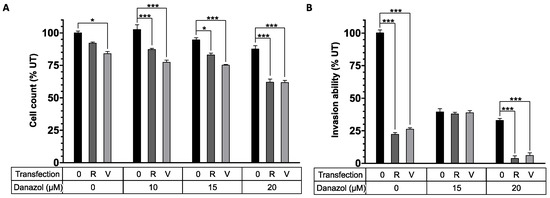 CPP/siRNA nanoparticles were applied on cells growing on the 24-well plate as usual, directly followed by the addition of danazol (Cayman Chemical, Ann Arbor, MI, USA) dissolved in 96% ethanol (Thermo Fisher Scientific, Waltham, MA, USA) at different final concentrations (10, 15, and 20 µM). The concentration of danazol and treatment duration was chosen relying on previously described results in the literature []. Then, 48 h post-treatment, cells were fixed with ice-cold absolute methanol (Thermo Fisher Scientific, Waltham, MA, USA) and stained with 1% methylene blue (BioGnost, Zagreb, Croatia). After washing the stained cells with PBS, methylene blue was eluted with 1 M HCl (Sigma-Aldrich, St. Louis, MO, USA) and its absorbance was measured at 650 nm for each individual sample. In case of invasion assessment, the cells were co-treated on 24-well plates and the invasive capability was measured as described previously in the methods’ invasion assessment section.