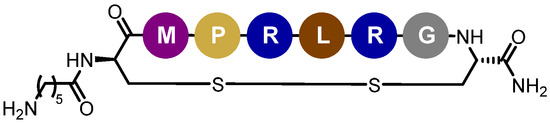 On the basis of our previous formulation studies, the development and the pharmaceutical characterization of tegaserod-loaded lipid nanoemulsions will be realized [38]. Considering that the LDL-Rs is a relevant target to shuttle therapeutics into the CNS after receptor-mediated transcytosis, functionalization of the nanoemulsions will be attempted by a peptide ligand having an improved binding affinity for this receptor [39]. Peptide-22 is a cyclic peptide with reduced peptide bonds and one non-natural amino acid that exhibit a half-life of about 3 h and no competition with endogenous LDL [39] (Figure 1). From in vitro and in vivo studies, the interest in the surface modification of polymer nanoparticles or of liposomes by peptide-22 to facilitate BBB permeability and to improve therapeutic efficiency of carried anticancer drugs into the brain has already been demonstrated [40,41]. However, to date, no lipid nanoemulsions functionalization, nor application to AD therapeutic tools, have been reported. Thus, the final aim of the present work is to functionalize and characterize by the most potent available techniques the peptide-22-functionalized tegaserod-loaded nanoemulsions to allow their further valuable preclinical evaluation.