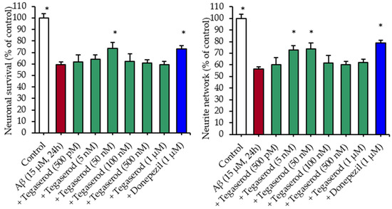 Several 5-HT4R agonists (RS67,333, donecopride) have been proven to show beneficial effects on learning and memory loss in 5XFAD mouse model, with a reduction of the number of observed amyloid plaques [5,54]. In regard to these results, the effects of tegaserod on neuronal survival and on the neurite network were investigated in rat primary hippocampal neurons exposed for 24 h to soluble Aβ1–42 peptides. As previously reported [54], the application of the soluble Aβ peptides led to a significant loss of neurons and to an important neurite network reduction (Figure 2). Donepezil, used here as a positive control, displayed a neuroprotective effect and was able to preserve the neurite network. As with donepezil, but at a lower required concentration (50 nM vs. 1 µM), tegaserod appeared to be able to protect neurons from death, and exerted also protective effects on the neurite network at the low tested concentrations of 5 and 50 nM. Last, as already observed for another promising drug for AD, donecopride, acting not only as an AChE inhibitor and a 5-HT4R agonist [55], high doses of agonists could induce the downregulation of 5-HT4 receptors.