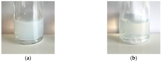 The nanoemulsion formulation, and the same spontaneous emulsification process, previously described by our team [38], was transposed to tegaserod. After formulation, the obtained tegaserod-loaded nanoemulsions (Tg-NEs) had a clear appearance with a slight greenish coloration attributable to tegaserod (Figure 3). The Tg-NEs were characterized in terms of granulometric properties, physicochemical properties and efficacy of encapsulation (Table 4). The encapsulation of tegaserod succeeded with an encapsulation efficacy higher than 90% at a drug payload of 1 mg/mL. The hydrodynamic diameter slightly decreased. PDI was not changed relative to the blank-NEs, since remaining lower than 0.2, indicating the presence of a monodisperse population. However, the incorporation of the tegaserod into the NEs was characterized by a slight but significant increase of ζ-potential (p < 0.0001). This observation was consistent with the pKa values of tegaserod and the fact that its mono protonated form was predominant at pH 7.4. In this way, these results indicated that a part of tegaserod could be located at the oil/water interface of nanoemulsions.