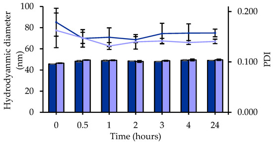 The average hydrodynamic diameter and the polydispersity index (PDI) were determined by dynamic light scattering (DLS), using a Zetasizer Ultra® apparatus (Malvern Instruments, Worcestershire, UK) equipped with a 633 nm laser at a fixed scattering angle of 173°. Each analysis was carried out at 25 °C, and samples were diluted 1/100 (v/v) in 1 mM NaCl solution. Three consecutive measurements were performed for each characterization.