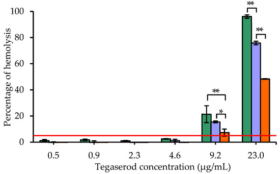 Hemolysis tests were realized according to the protocol previously described by our team [38]. Briefly, whole human blood samples from three healthy compatible volunteers were collected in Li-heparin tubes (Etablissement Français du Sang, EFS Hauts-de-France-Normandie, France), pooled and diluted in DPBS to adjust the total hemoglobin concentration at 10 mg/mL. For each test, 100 µL of sample was introduced into microtubes with 700 µL of DPBS and 100 µL of diluted blood. Tegaserod suspension or tegaserod-loaded nanoemulsions, with and without adsorbed peptide-22, were incubated with blood at the final concentration range of tegaserod 0.5–23.0 µg/mL, during three hours, at 37 °C, with constant horizontal shaking (water bath WNB-22). After incubation, the samples were centrifuged (15 min at 850× g, 25 °C, using a Universal 320R apparatus, Hettich, Bäch, Switzerland), and the hemoglobin released during the hemolysis test was quantified by spectrophotometry (Infinite M200, Tecan, Männedorf, Switzerland) by determining the absorbance of red cyanmethemoglobin (CMH), at 540 nm, in a 96-well plate.