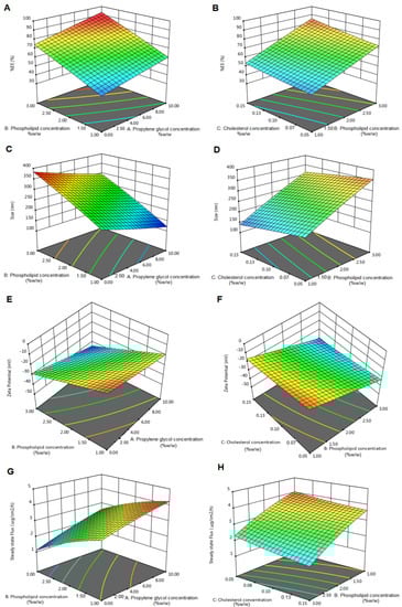 3D response surface plots showing the effect of phospholipid and PG concentrations and the effect of phospholipid and cholesterol concentrations on % EE (A,B), particle size (C,D), zeta potential (E,F) and steady state flux (G,H).