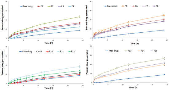 The dissolution volume for RXF release and permeation studies from RLDL formulations was determined by calculating RXF’s saturated solubility. Because RXF’s solubility is 0.18 mg/mL, a dissolution medium containing 50 ml of IPB + 0.1% w/w of Tween 80 has a high solubility enough to satisfy the sink condition. The release was studied and found to range from 39.24 ± 0.47% to 66.92 ± 0.50%. The enhancement in release was significantly (p < 0.05) achieved by increasing X1 and decreasing X2 and X3. Additionally, the permeation profile of different RLDL formulations was studied as shown in Figure 2. When compared to different RLDL formulations, RXF permeation from free RXF was significantly (p < 0.05) lower. Figure 1G,H shows that the enhancement in permeation and mucosal flux were significantly (p < 0.05) achieved by increasing X1 and decreasing X2 and X3. The skin deposition was studied and found to range from 83.52 ± 0.97 to 155.17± 0.50 µg/cm2. The decrease in skin deposition was significantly (p < 0.05) achieved by increasing X1 and decreasing X2 and X3. These outcomes were obtained because phospholipids contribute to the formation of lipid bilayers [9]. Cholesterol is a stiff molecule that improves the stability and rigidity of the lipid bilayer [11,41]. They prevent leakage and reduce the permeability of vesicles [42]. Increasing the negative charge of deformable liposomes increases vesicle flexibility and creates a more fluid bilayer [8,11].