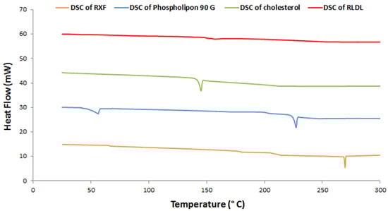 Differential scanning calorimetry (DSC-60F3, NETZSCH-Geratebau GmbH, Maia, Germany) was used to examine the thermal analysis of the RXF, phospholipid, cholesterol, and RLDL [22]. Samples (3–5 mg) were accurately weighed into 50 µL DSC aluminium pans with a thickness of 0.1 mm. DSC thermograms were done at a heating rate of 5 °C/min and a nitrogen gas flow rate of 25 mL/min. After heating the samples to 300 °C, they were quickly cooled to 25 °C.